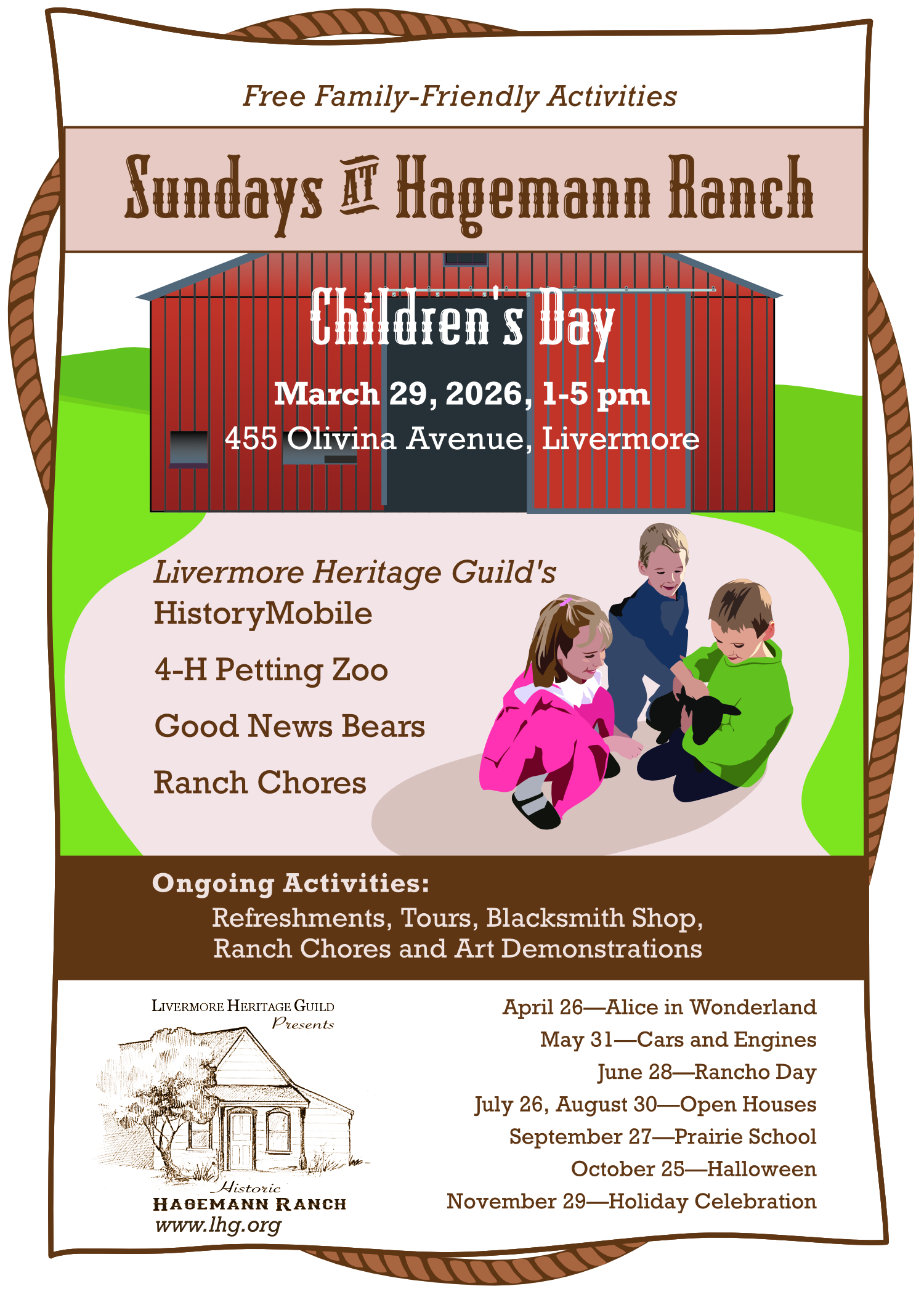 Children’s Day on March 29th from 1-5 PM will be all about animals and children! 4-H will have a petting zoo and our special guests will be pair of Kunekune pigs for the kids to visit. The HistoryMobile will be on site for all to explore. Everyone can help with ranch chores in the backyard. Lots of vendors and artists will be on site. Always free and family-friendly at 455 Olivina Ave., Livermore.