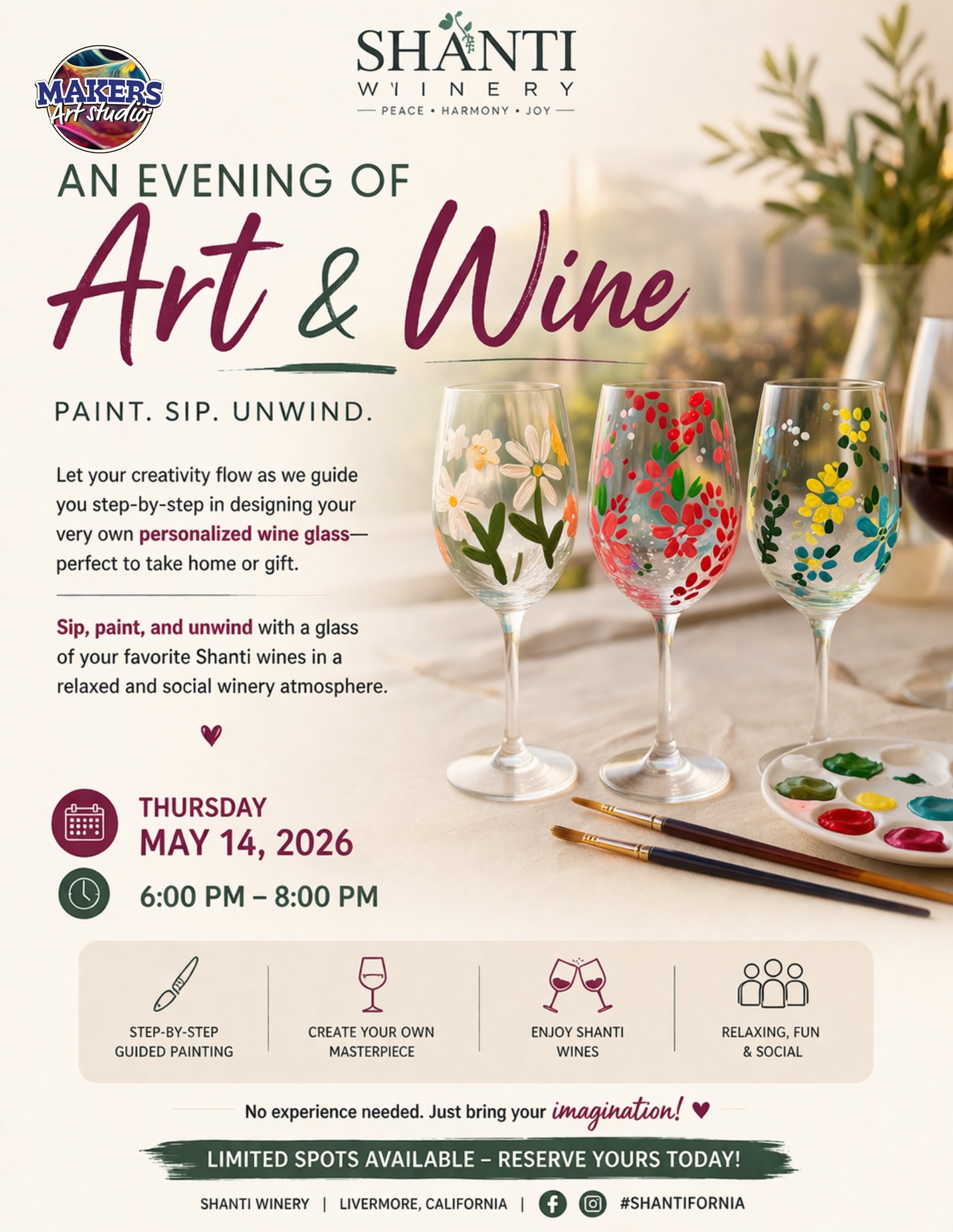Let your creativity flow as we guide you step-by-step in designing your very own personalized wine glass— perfect to take home or gift. Sip, paint, and unwind with a glass of your favorite Shanti wines in a relaxed and social winery atmosphere.